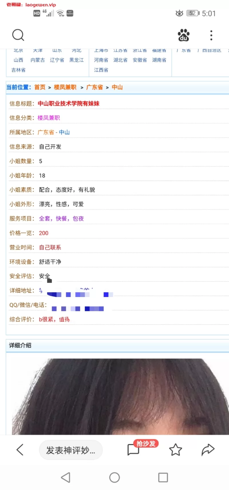 威客管理提示:要求付定金 保证金的,总之提前要钱的都是骗子 很年轻漂亮的一个小mm,不能说是女神级别,但已经是很漂亮的,穿着性感睡衣,外面简单披件厚外套,胸很大,快要跳出来了,看到我已经硬了,跟着mm到了家,房子环境中等,但还算干净整齐,里面东西不多,应该mm没有搬来多久,160左右吧,屋里开着暖气,暖气真是个伟大的发明,要是没有暖气,这天气小弟弟都起不来,脱光光洗澡,想不到小mm也很专业,先试水温,再给我洗,每个位置都洗到,手指脚指都有洗,她洗她的,我玩我的,胸部真心不错,又大又软,不怎么下垂,乳头粉,超正,小弟弟洗得然后干净,之后给我来口了一会,好舒服,有点想捉住她的头给我口,不过不好意思搞湿她的头,之后回床,或者下场,服务也可以,基本上都是全套的,专业的感觉,而且认真,之前还担心年轻的mm不会服务,没有想到服务也是正常好的,后面爱爱,年轻小穴还行吧,紧,不是夹出来的,有弹性,大家都比较愉快,大战后出水。4张。真心不错。我之前也玩过很多mm,天河那些动不动就4,5百,没有服务不说,有些连面都是黑的,这里的少妇也都是400了,这个mm颜值身材年纪什么的都比得上天河那些mm,服务又比得上相同价格的少妇。我感觉性价比还是很明显的。毕竟颜值身材年龄都是上品,mm问过我价格怎么样,能不能高一点,我和他说,400非常合理,不要再高了,因为附近的mm多数都是这个价格,有些还300,她虽然比她们好,但也不要乱涨。其实我是真心不希望肉价越来越高。希望她也不会涨,有兴趣的可以试试,绝对值回票价!