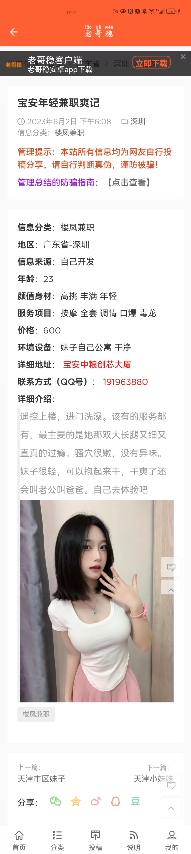 这根本开始钓鱼的,加QQ联系是这样的。结果来到是个30+的阿婶,身材真的0分。原本上门还要加200,付完钱后又要收100路费。真的,去洗浴都不要找这些了。