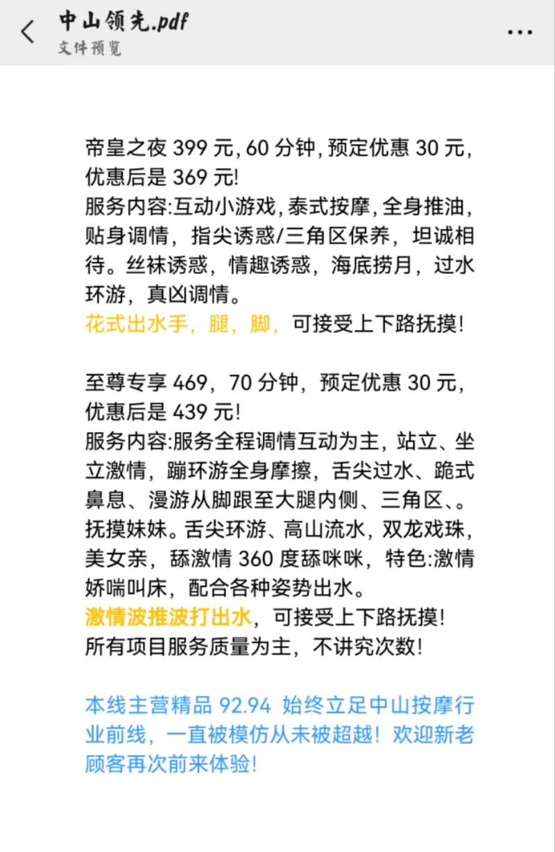 信息分类:足浴发廊 地区:广东省-中山 信息来源:网络 年龄:22-30 颜值身材:6-8 服务项目:92、94 价格:300-400 环境设备:一般 详细地址:本段信息已隐藏,请先登陆。点击登陆 , 或者 点击注册 联系方式(微信):本段信息已隐藏,请先登陆。点击登陆 , 或者 点击注册 详细介绍: 服务还可以,技师也不催,态度也挺好的 足浴发廊