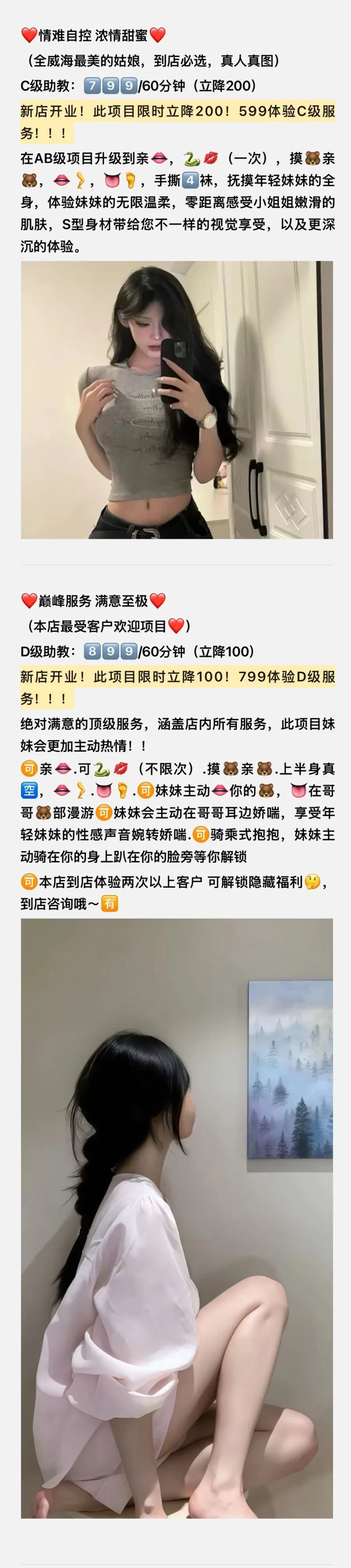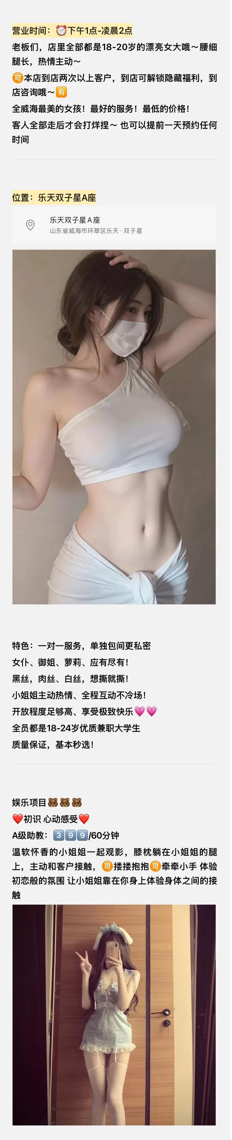 有一次去仰天山玩啥,坐车过去,在那里的宾馆住下来了。那边很多宾馆都有服务,就一个宾馆妹子超级正,身材脸蛋可以95以上了,模特一样,可惜不做。是老板的妹妹好像,然后小狼就有点饥渴难耐了,去吃了个饭,然后看到后面街上好多足疗保健,看到一家mm非常年轻,估计不到20把,太年轻了,然后我先去了宾馆,拿钱,出来后发现已经关门了,哪个时候才8点左右,估计在接客,然后有点失望至极,就去了另一家,远看还可以,结果进屋一看有点不年轻,30左右把,谈好价格100加口,草草了事,给钱走人,没有体验到年轻的快餐,下次在去找找体验下。